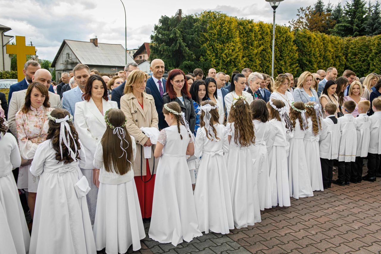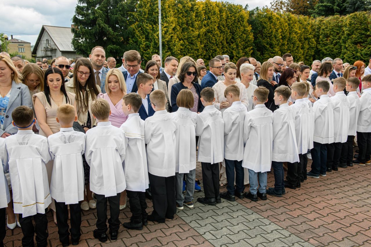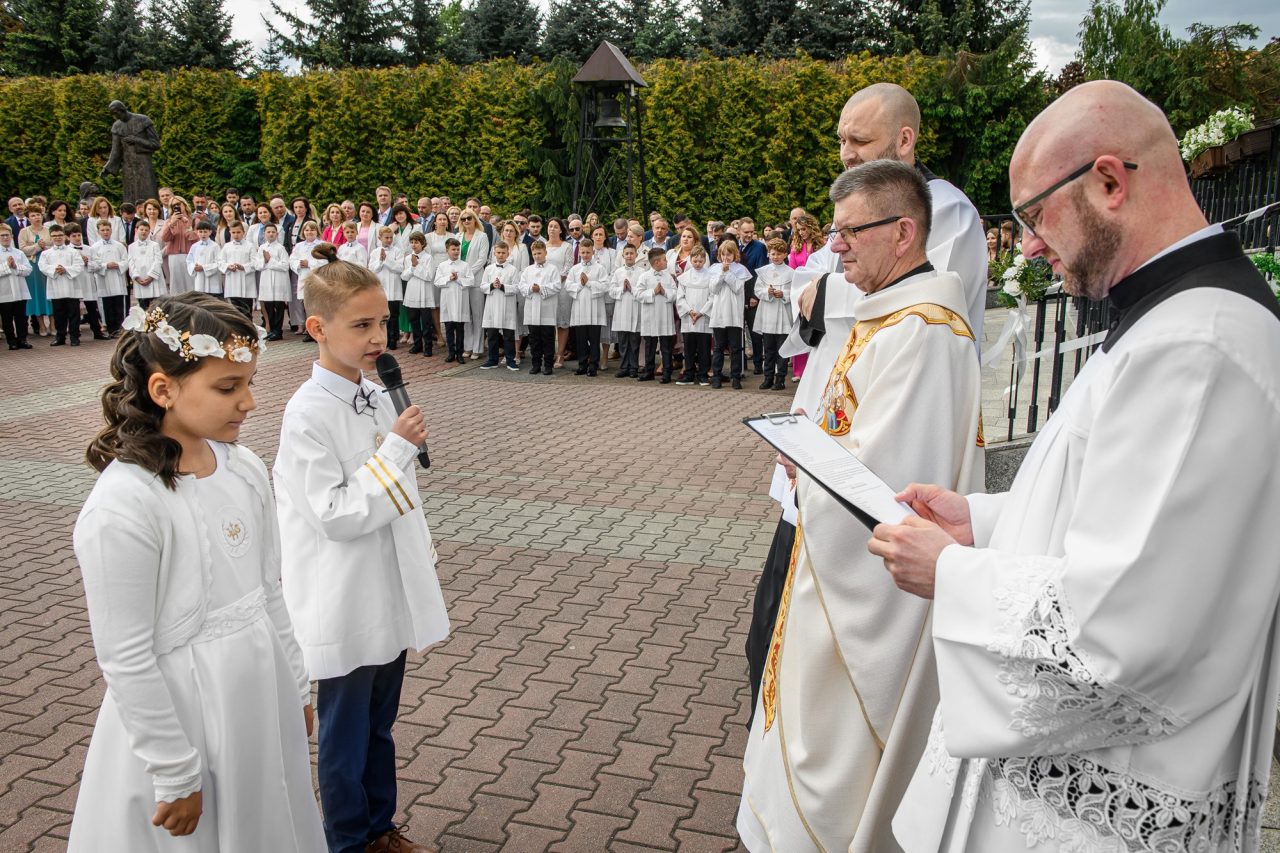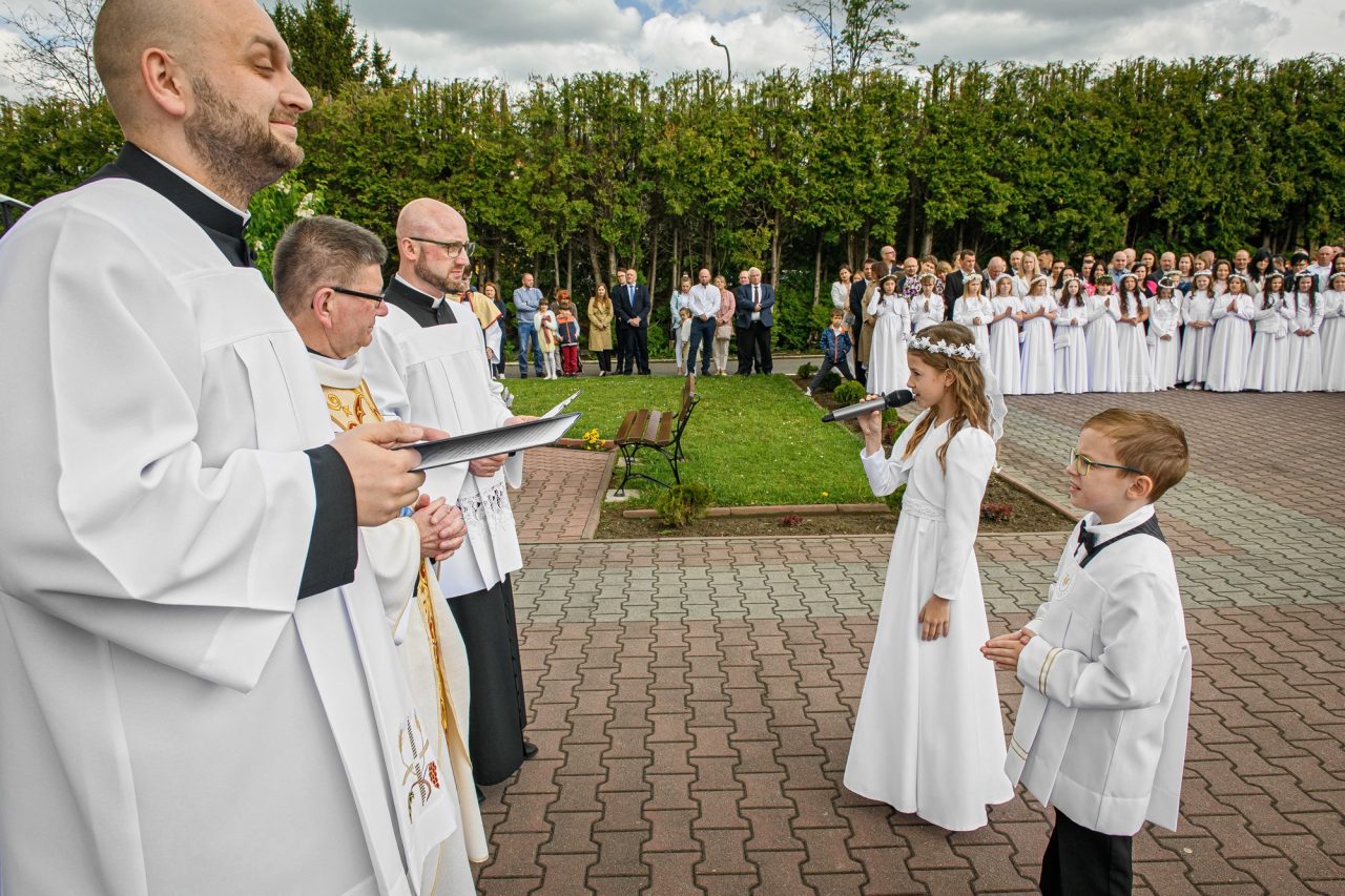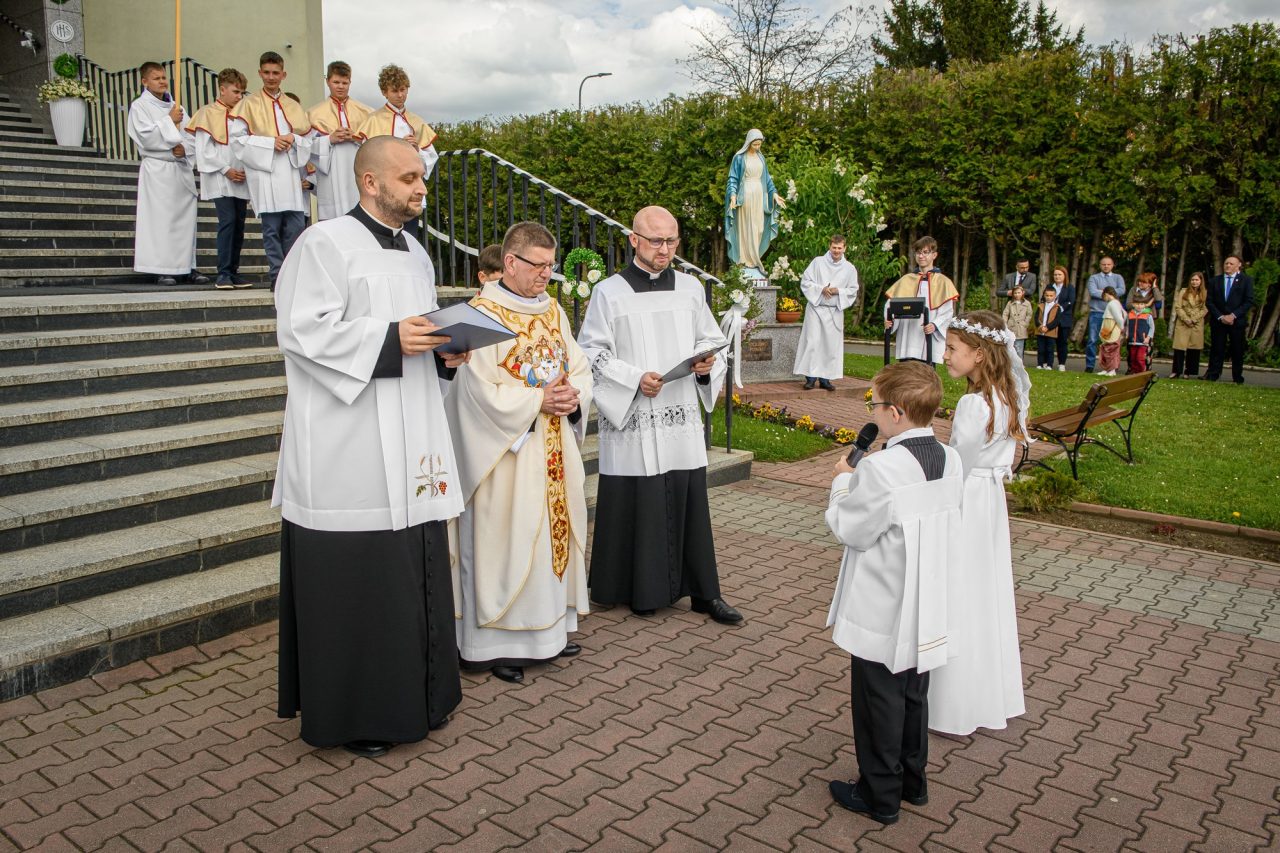W tym wyjątkowym dniu, na placu przed kościołem ksiądz Proboszcz Zbigniew Góra w asyście ks. Pawła Serwańskiego i Ks. Karola Lenia, odpowiedzialnych za przygotowywanie dzieci do tego wydarzenia, witał  i błogosławił dzieci. Następnie błogosławieństwa udzielili rodzice.