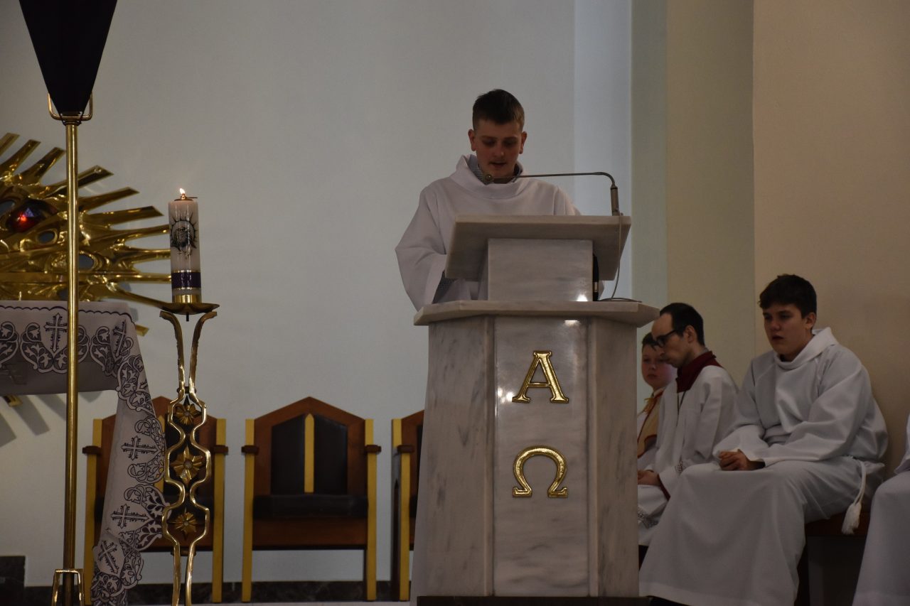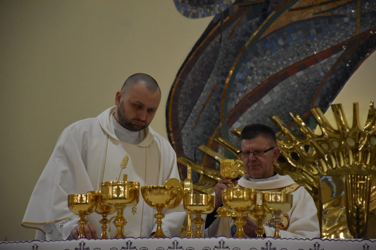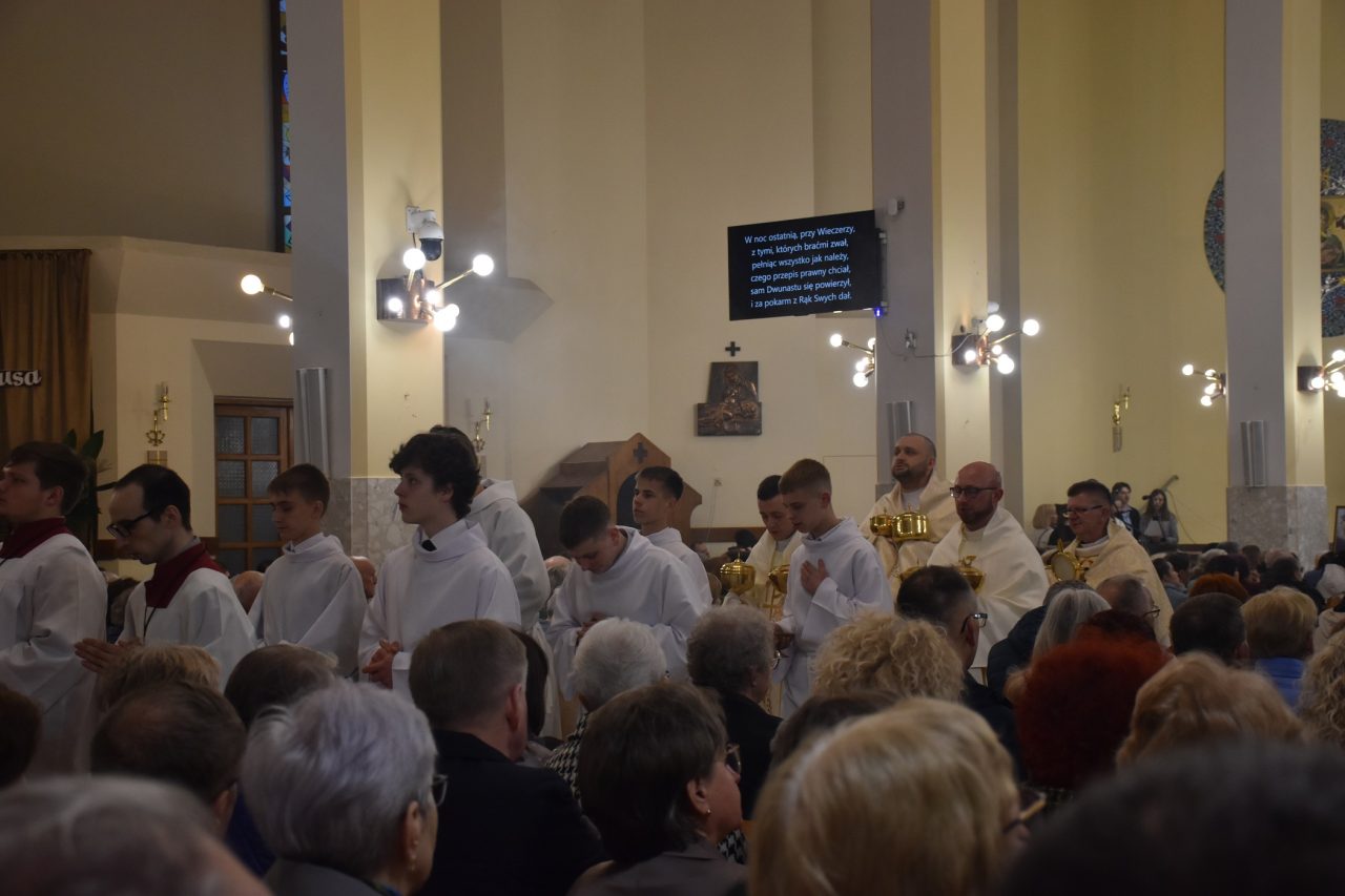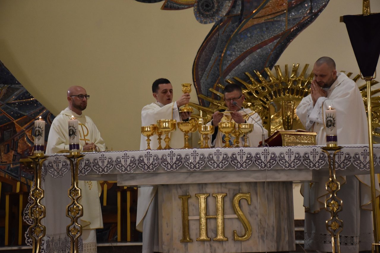 Wielki Czwartek jest liturgicznym dniem, kiedy Jezus zgromadzony ze swoimi uczniami w Wieczerniku ustanowił sakramenty Eucharystii i kapłaństwa. Stąd też, po uroczystej procesji wejścia, rozpoczynającej Najświętszą Ofiarę, nasi Kapłani zostali obdarzeni życzeniami od najmłodszych parafian oraz przedstawicieli wspólnot parafialnych, będącymi wyrazem wdzięczności za posługę duszpasterską wobec wspólnoty Chrystusa Króla w Sanoku. W tym dniu, Słowo Boże skierował do nas ks. Paweł Serwański, który uświadomił nam prawdę, że Eucharystia jest ucztą miłości, a zaproszeni na nią powinni wyrażać swoim życiem wdzięczność Zbawicielowi, że pozostał z nami i pozostawił nam pokarm, na drogę ku wieczności.