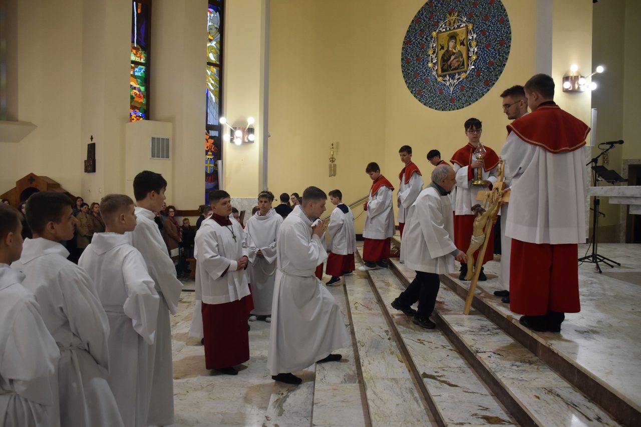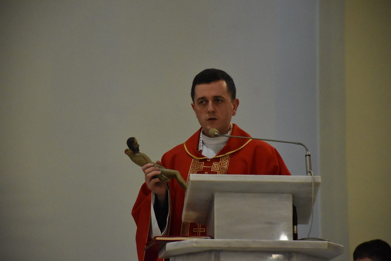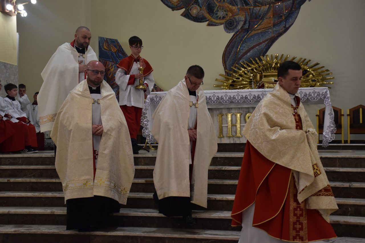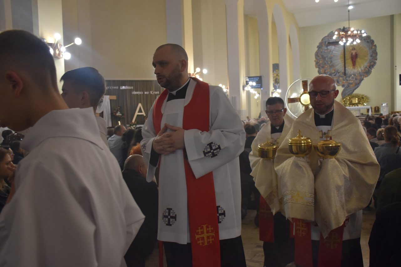 Następnie, księża wikariusze naszej parafii odśpiewali Mękę Pańską, po której nastąpiło kazanie ks. Łukasza, uświadamiającego nam sens ofiary krzyżowej, która każdego dnia jest ponawiana w sposób bezkrwawy podczas Mszy świętej, a która otwiera nam drogę do nieba, stając się przebłaganiem za nasze grzechy wobec Boga Ojca.
