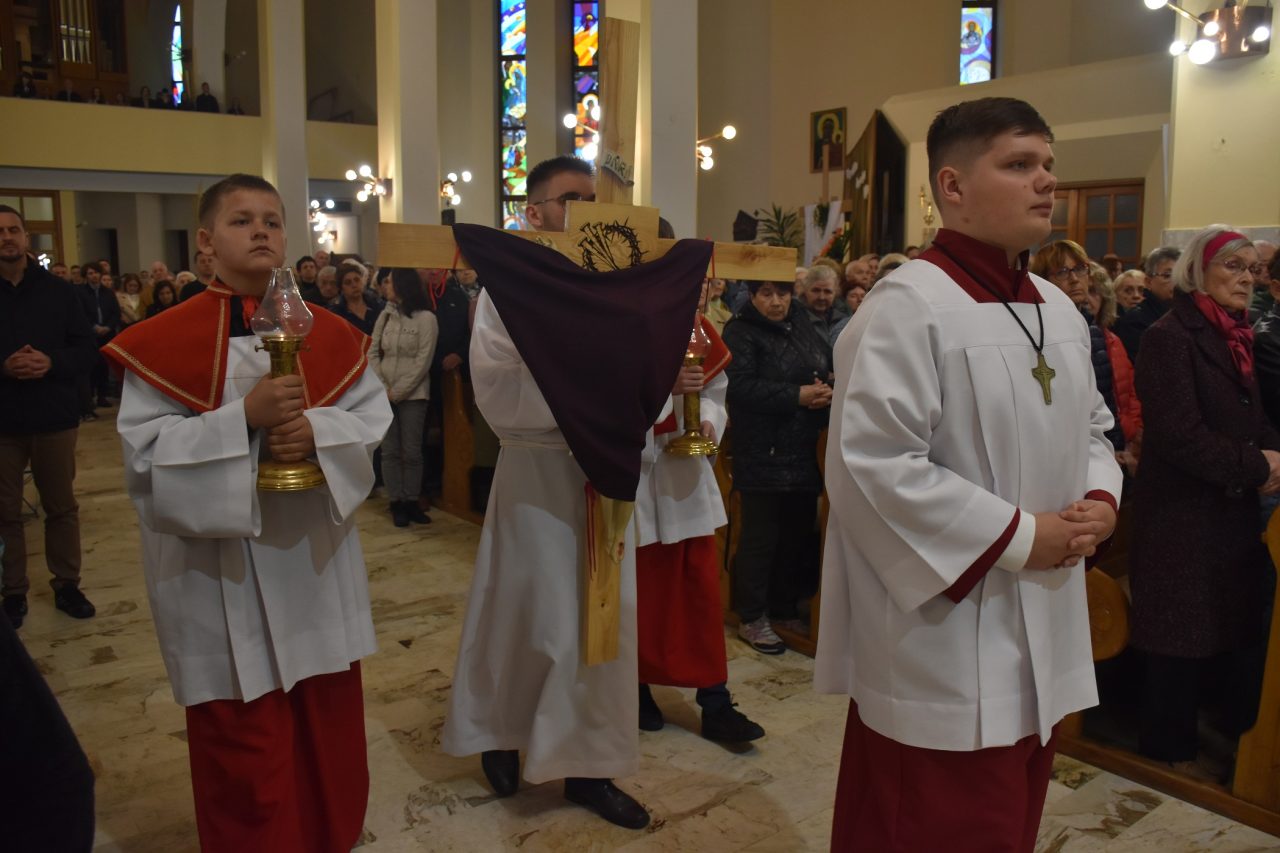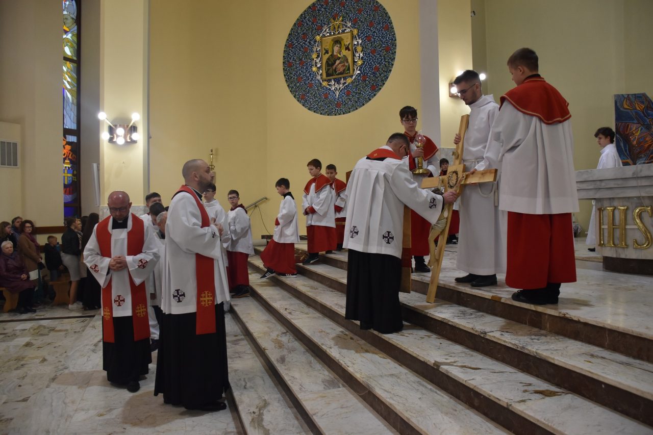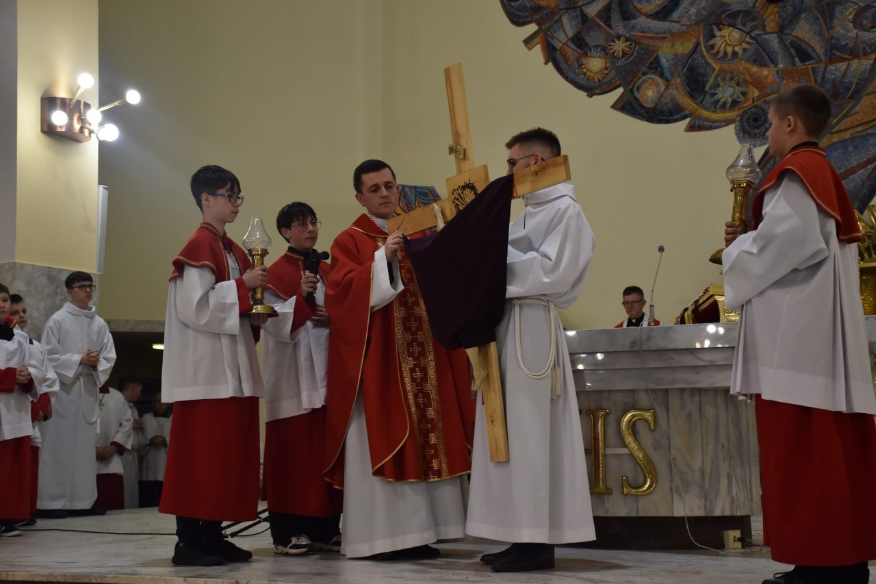 Centralnym wydarzeniem liturgii wielkopiątkowej była adoracja Krzyża. Zasłonięty fioletowym suknem Krzyż, uroczyście wniesiony przez Liturgiczną Służbę Ołtarza, został odsłonięty przez celebransa, po trzykrotnym śpiewie: „Oto drzewo Krzyża, na którym zawisło zbawienie świata” i odpowiedzi wiernych: „Pójdźmy z pokłonem”. Po zakończonej liturgii, Krzyż został udostępniony wiernym, aby każdy mógł wyrazić swoją wdzięczność Chrystusowi, poprzez znak adoracji.