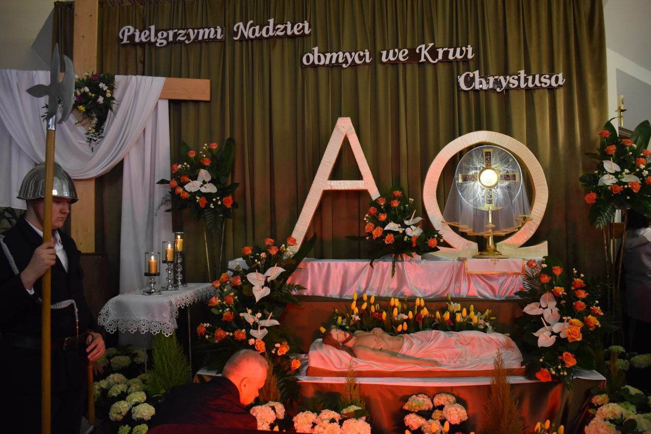Dopełnieniem liturgii Wielkiego Piątku, była procesja do Grobu Pańskiego. Tam, na specjalnie przygotowanym tronie, został wystawiony Najświętszy Sakrament w monstrancji, okryty białym przejrzystym welonem – symbolem całunu, w który zostało owinięte ciało zmarłego Jezusa.